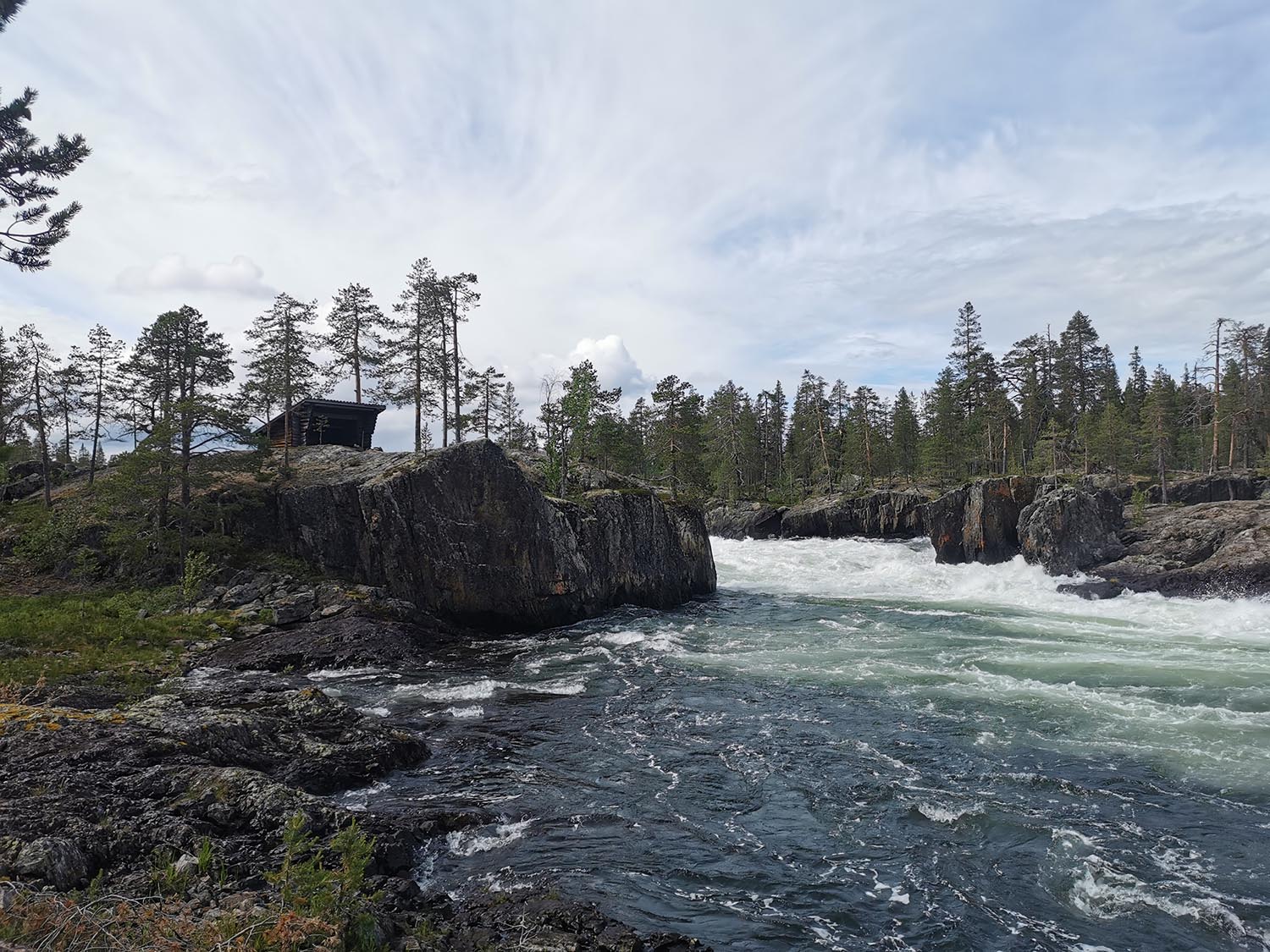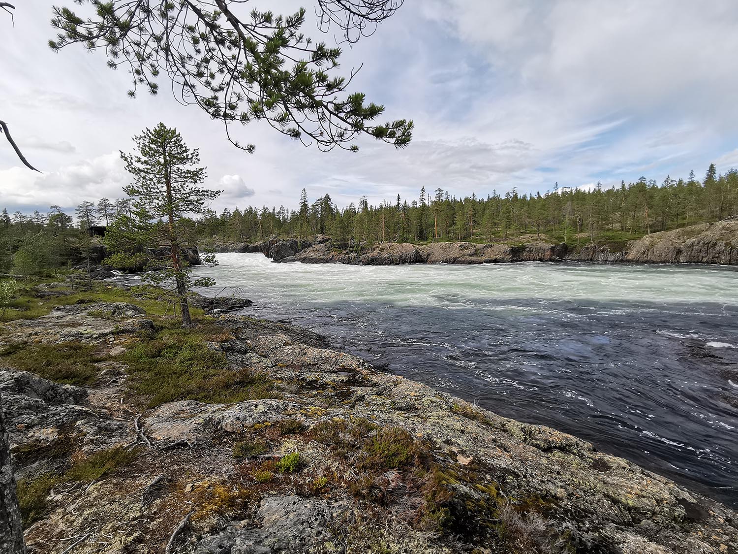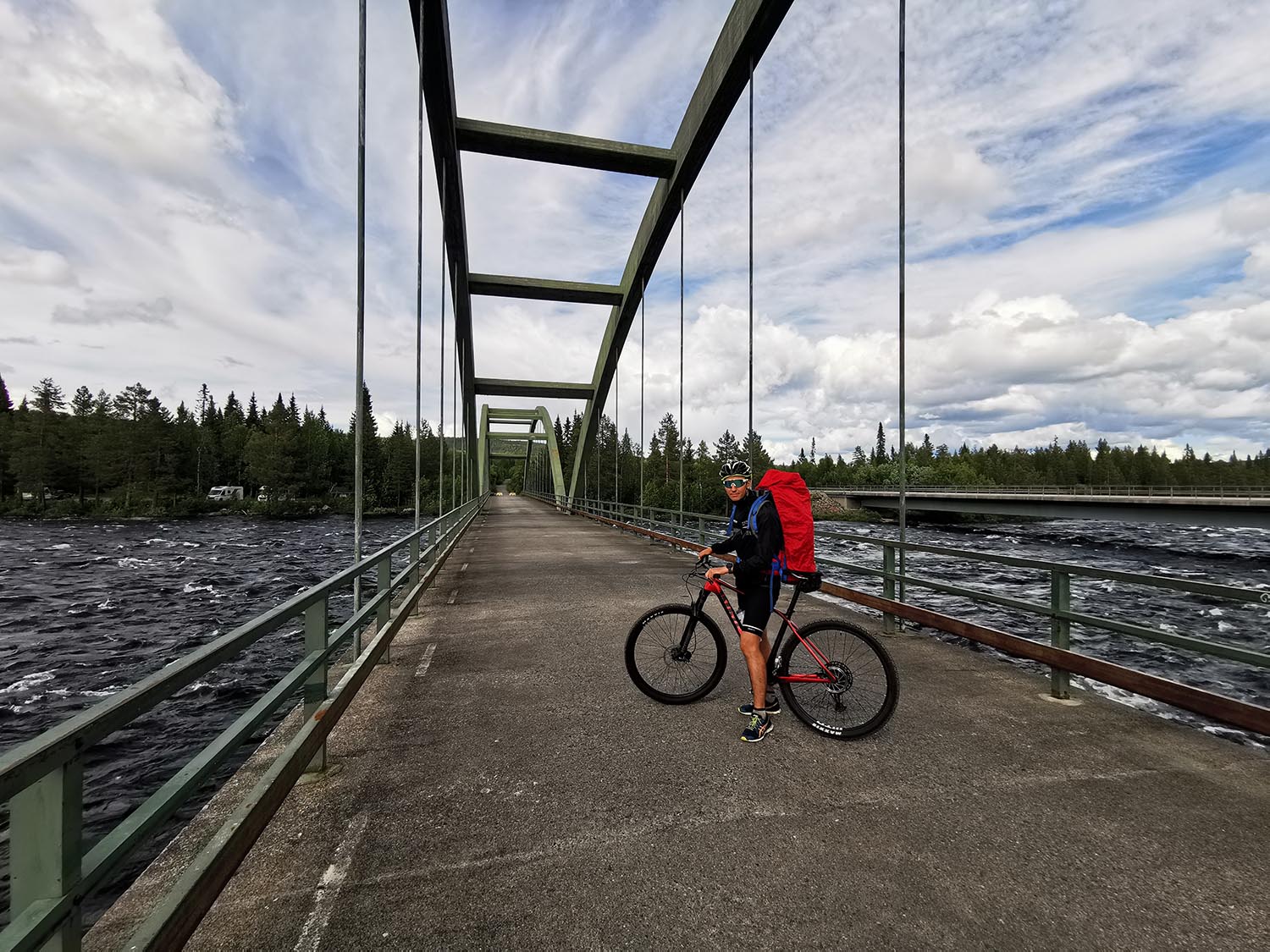 Vi cyklade på i lugn takt förbi Benbryteforsens fricamping där många husvagnar stod uppställda och förbi till Benbryteforsen som var vårt första mål. Mäktig fors där vi tog någon bild. Väldigt mycket vatten i Piteälven nu. Är det fortfarande smältvatten från fjällen eller har det regnat mycket? var något vi funderade på. Vi cyklade vidare en liten bit och tänkte att "det här kan ju inte ta så lång tid", när vi hunnit en fjärdedel av cykelfärden på mindre än en timme.