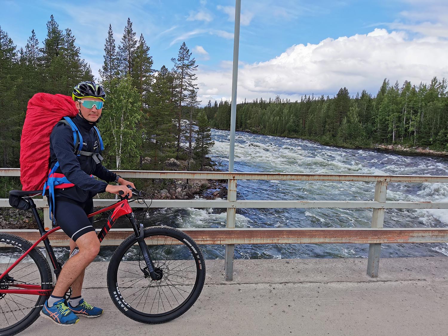 Sedan var det dags att gå ner igen. Nerfärden blev betydligt lättare och snabbare än vägen upp och i och med att vi kunde springa snabbare så var inte heller myggen en lika stor plåga. Vi hoppade på cyklarna igen och fortsatte på grusvägen ut mot 45:an. Efter en liten stund var vi ute vid den stora vägen och kom till Burmabron som går över Ljusselforsen. Vi cyklade över gångbron och stannade till och tittade på forsen.