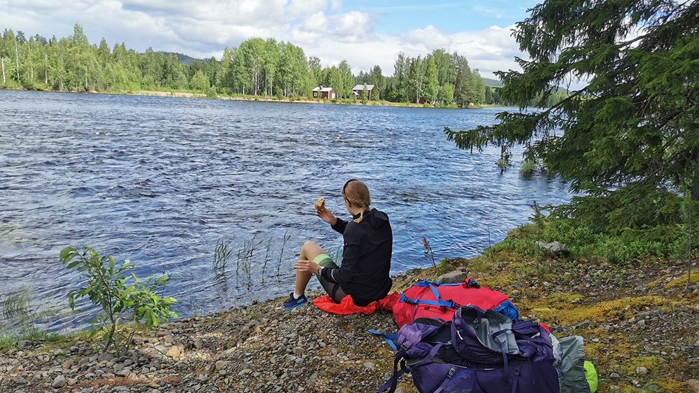 Här tog vårt äventyr slut. Vi kom aldrig över sjön och vi sprang aldrig norra sidan tillbaka till Trollforsen. Men trots detta var vi nöjda med våra två äventyrsdagar när vi satt på trappen till stugan i Jäkna och åt vårt sista godis och väntade på hämtning. Vi hade gjort det bra och fått se mycket vackert. Djur, otrolig natur och fina forsar. En fin ekopark att korsa. Trötta och hungriga blev vi upphämtade en timme senare och fick en chipspåse levererad. Räddaren i nöden.