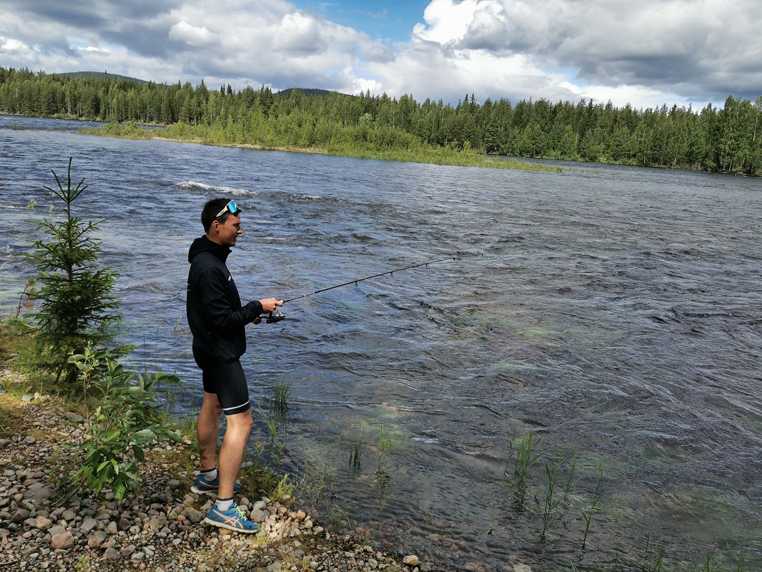 Vi cyklade ner till älven på ett ställe och tog lunch. Goda baguetter med färskost/mozzarella, tomat och lufttorkad skinka. Gott att kunna ha med så lyxig lunch. Rasmus som är helt fisketokig passade även på att kasta några kast men utan napp. Under lunchpausen startade vi vår nyinköpta Thermacell, en slags myggjagare, som vi var otroligt tacksamma att vi hade. För mygg var något det fanns gott om, på hela vårt äventyr.