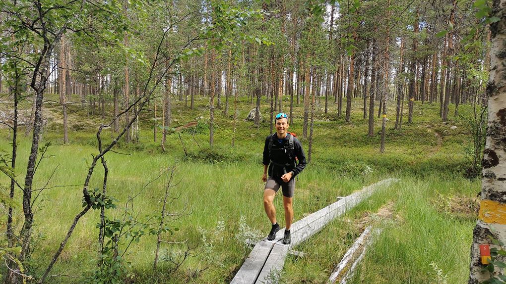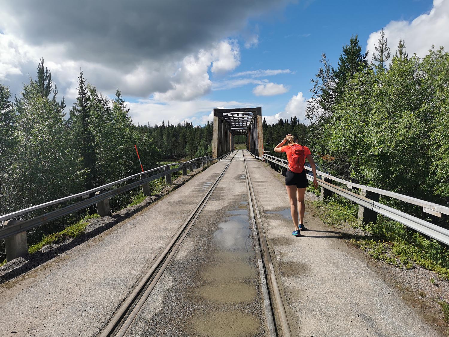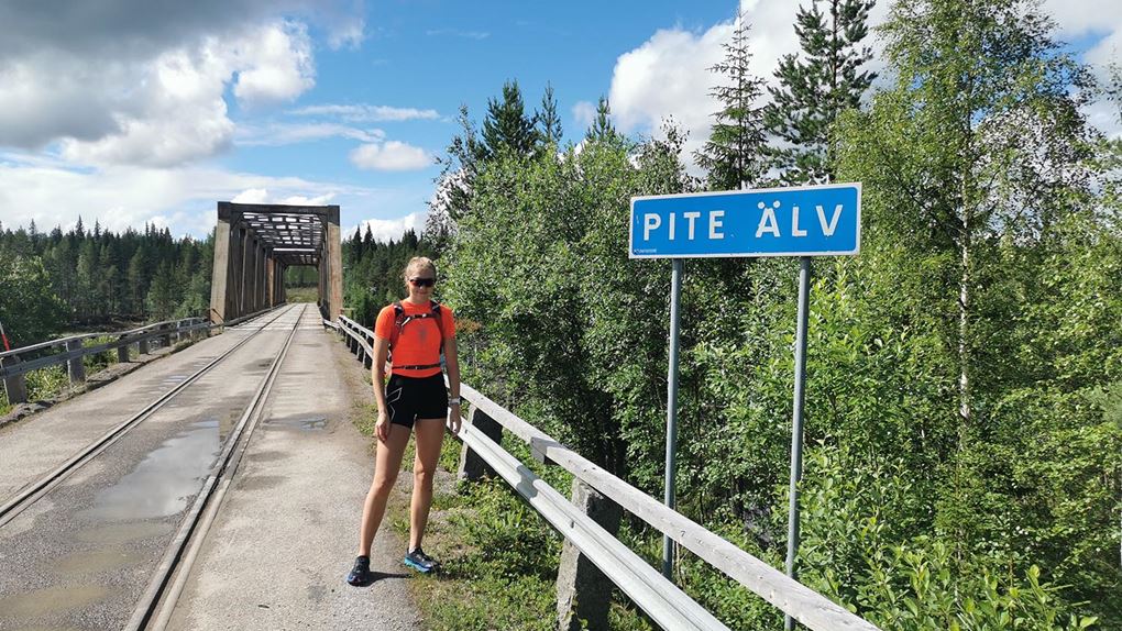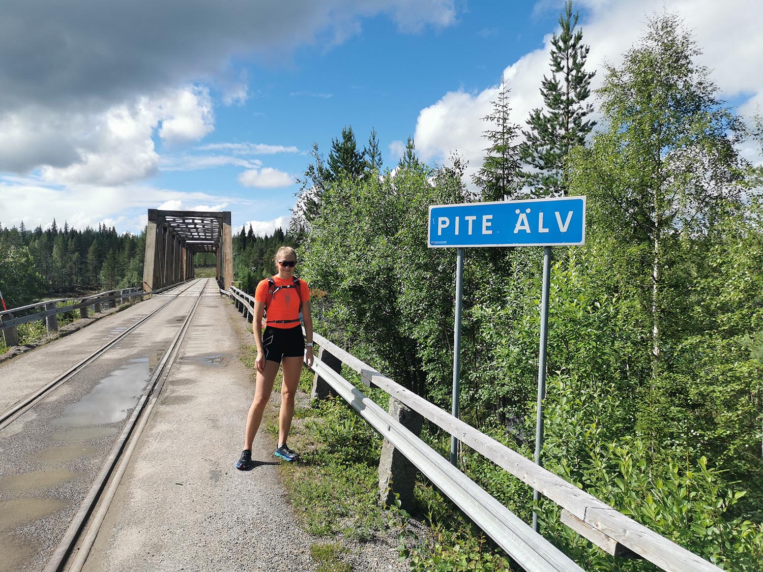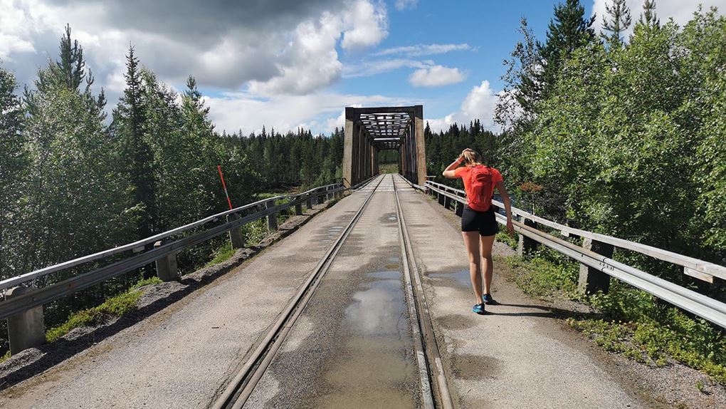 Vi sprang en bit efter en liten grusväg men där den tog slut fick vi lov att springa "off-road". Det var ganska jobbig skog att ta sig igenom, väldigt stenigt och en del myrland. Vi såg någon ren som vi inte fick med på bild och även lite andra fåglar. Vi sprang utan stig några kilometer tills vi kom till Piteälvsbron, där inlandsbanans tågräls och bilvägen delar på samma bro. Där tog vi någon bild, för att sedan fortsätta.