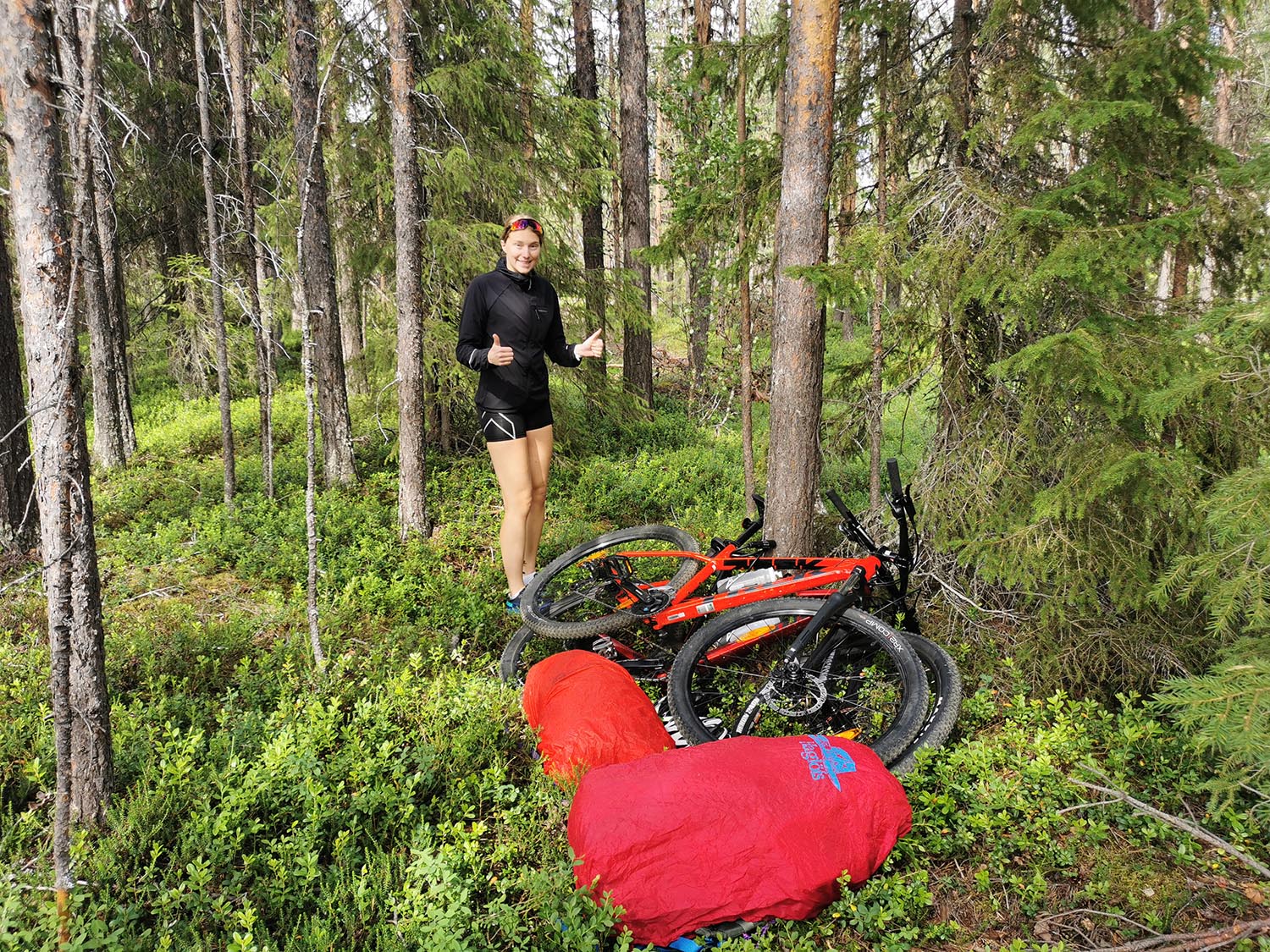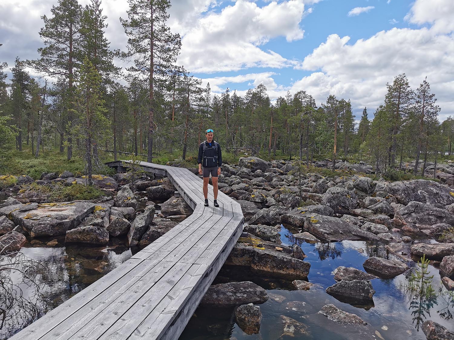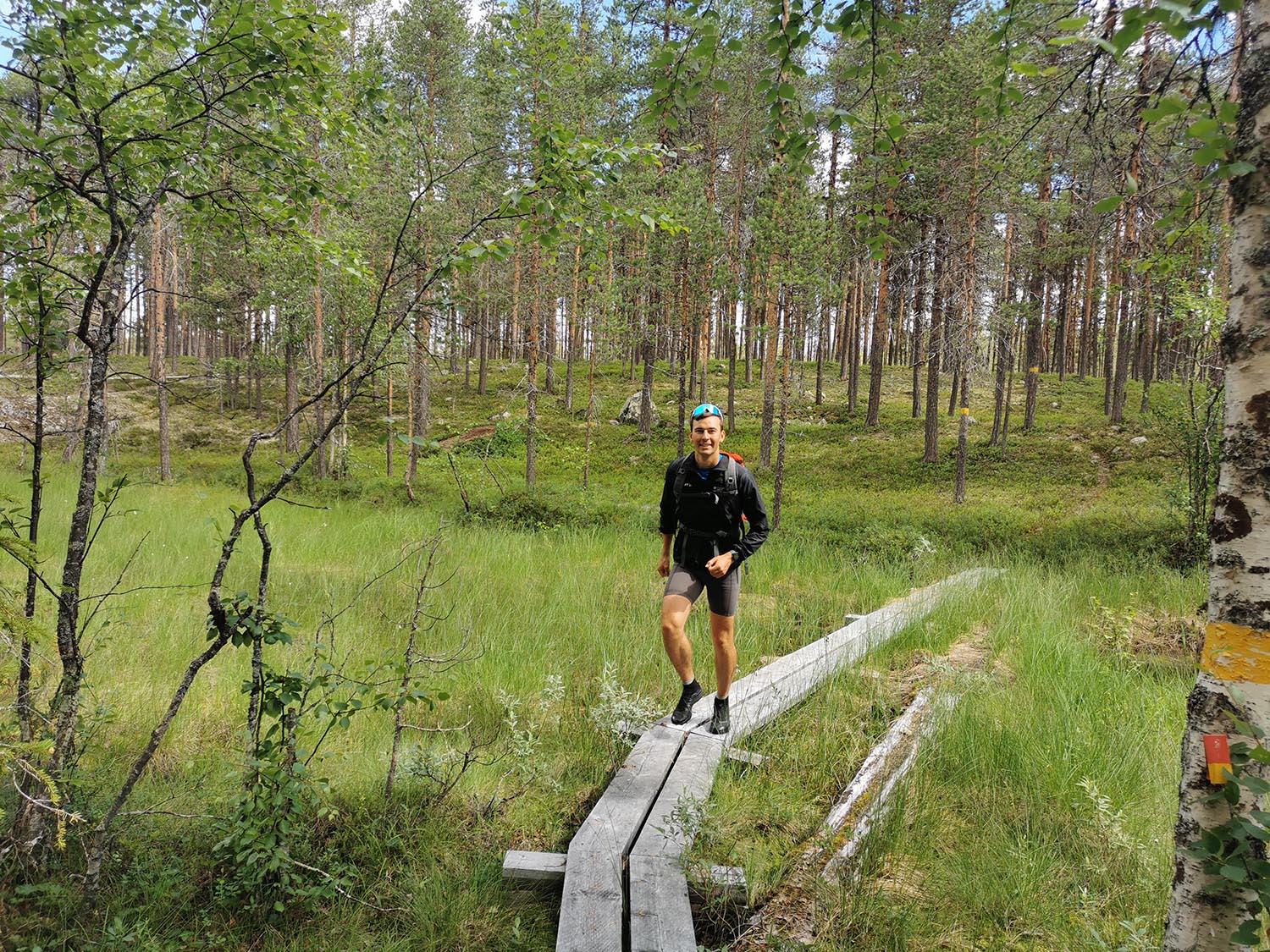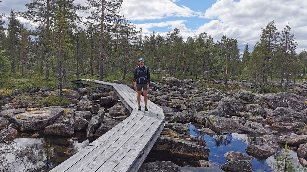 Vi sprang en bit efter en liten grusväg men där den tog slut fick vi lov att springa "off-road". Det var ganska jobbig skog att ta sig igenom, väldigt stenigt och en del myrland. Vi såg någon ren som vi inte fick med på bild och även lite andra fåglar. Vi sprang utan stig några kilometer tills vi kom till Piteälvsbron, där inlandsbanans tågräls och bilvägen delar på samma bro. Där tog vi någon bild, för att sedan fortsätta.