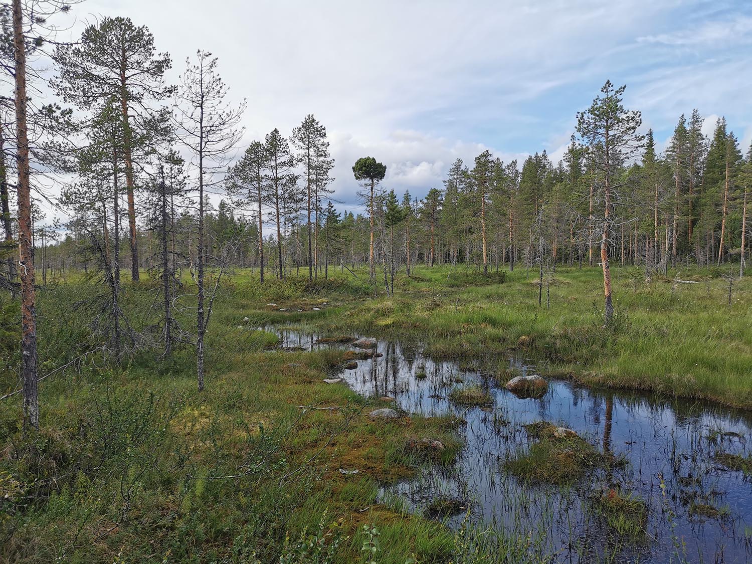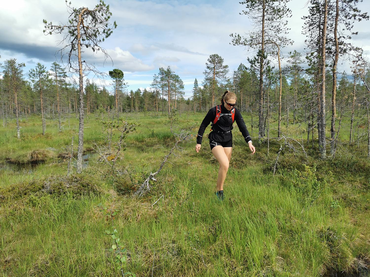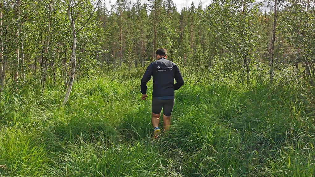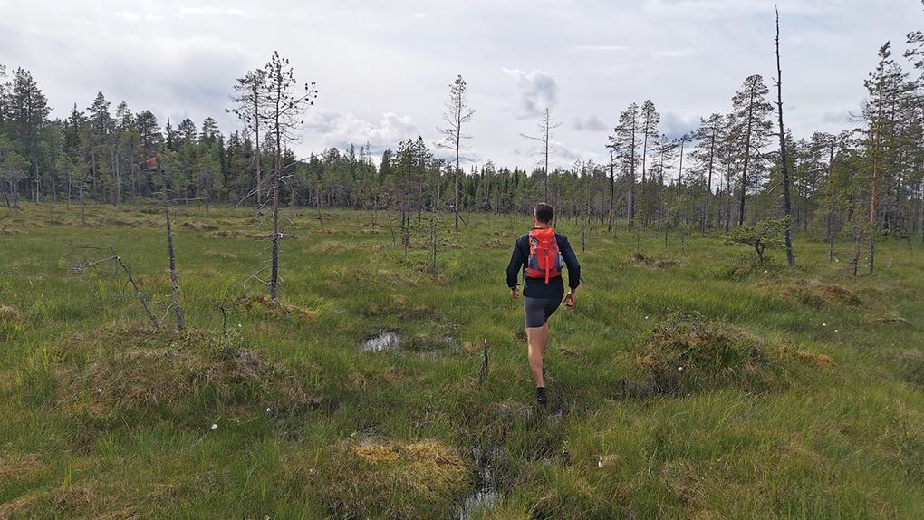 Mycket mossig mark med sten under, så det var lite trixigt hur man skulle sätta fötterna för att inte vricka dem. Uppför gick det, mygg var det och trött blev jag. Rasmus var stark och uppmuntrande och vi krigade på. Ingen av oss har nog någonsin varit med om så mycket mygg på ett träningspass, det var faktiskt fruktansvärt jobbigt. Kanske faktiskt den jobbigaste passagen på hela äventyret.