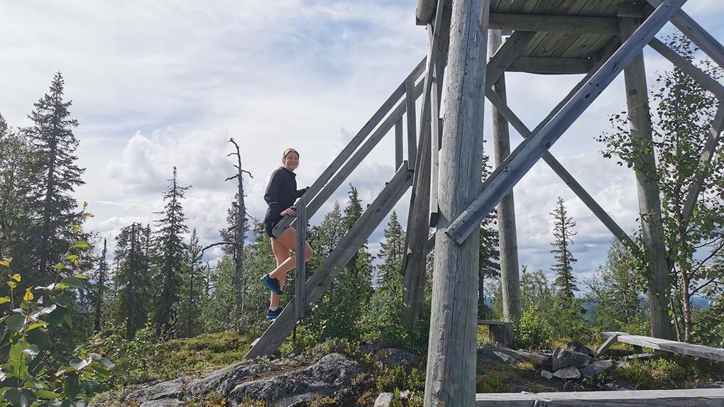 Upp till berget finns det en fin vandringsstig med lagom sluttning från andra hållet, men det skulle bli mindre äventyrligt om vi skulle cykla runt till den, så vi tog bara raka vägen upp. Och brant var det! Men upp kom vi till slut och oj vilken utsikt. På toppen finns ett utkikstorn där utsikten är helt otrolig. Vi såg långt, långt men även Piteälven med Burmabron och jag kunde peka ut ungefär vart vi skulle tälta till natten. Vi gick även in i toppstugan och flydde myggen en stund där vi kunde skriva i gästboken och äta lite bars och godis som vi tagit med i fickan.