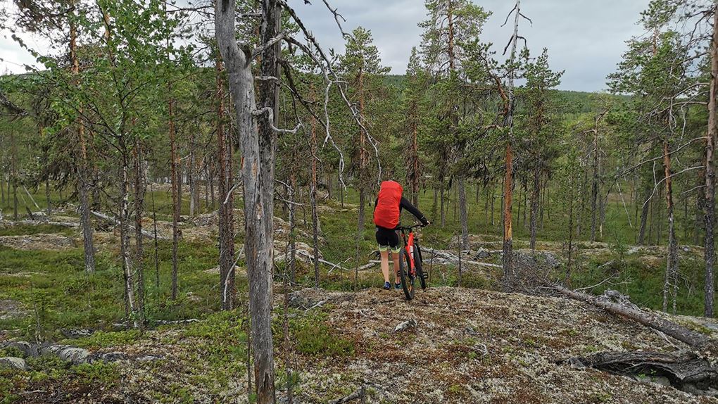 Efter lunchen cyklade vi vidare, fick ta upp och kolla på kartan då och då för att inte missa där vi skulle vika upp till berget. Tids nog hade vi cyklat tillräckligt långt för att lämna av cyklarna och ryggsäckarna och ta oss uppför Erik-Larsaberget till fots. Först över en liten myr där skorna blev blöta och sen bar det av uppför.