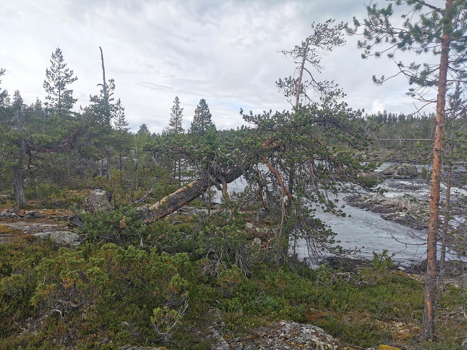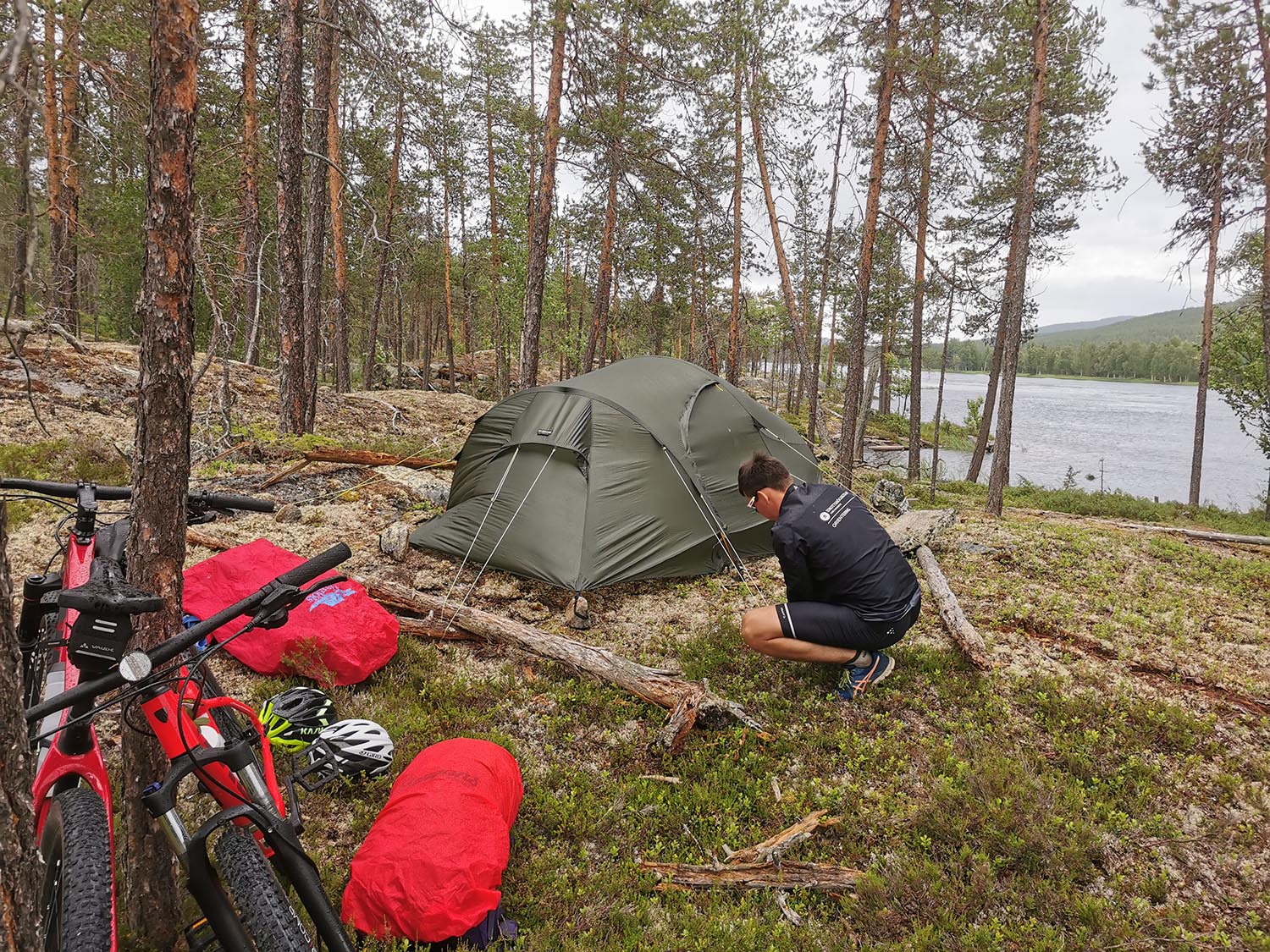 Sedan fortsatte vi upp efter norra sidan älven en bit och kollade ut en bra plats att slå läger på. Platsen blev på några fina hällar vid övre Ljusselet. När vi precis kommit fram såg vi hur dom mörka molnen drog ihop sig och vi försökte skynda oss upp med tältet. Snabbt kom det kraftigt regn och vind och vi fick verkligen jobba för att få tältet att stå på plats. I och med att underlaget var sten så var det omöjligt att få fast några tältpinnar, men vi var kreativa och knöt fast tältsnörena i träd, stockar och stenar och till slut var tältet uppe. Vi kröp in och gömde oss för regnet en stund och tryckte lite godis. Energin i kroppen började ta slut och vi var riktigt hungriga. Som tur var slutade det regna väldigt snabbt så vi kunde gå ut och sätta igång med maten.