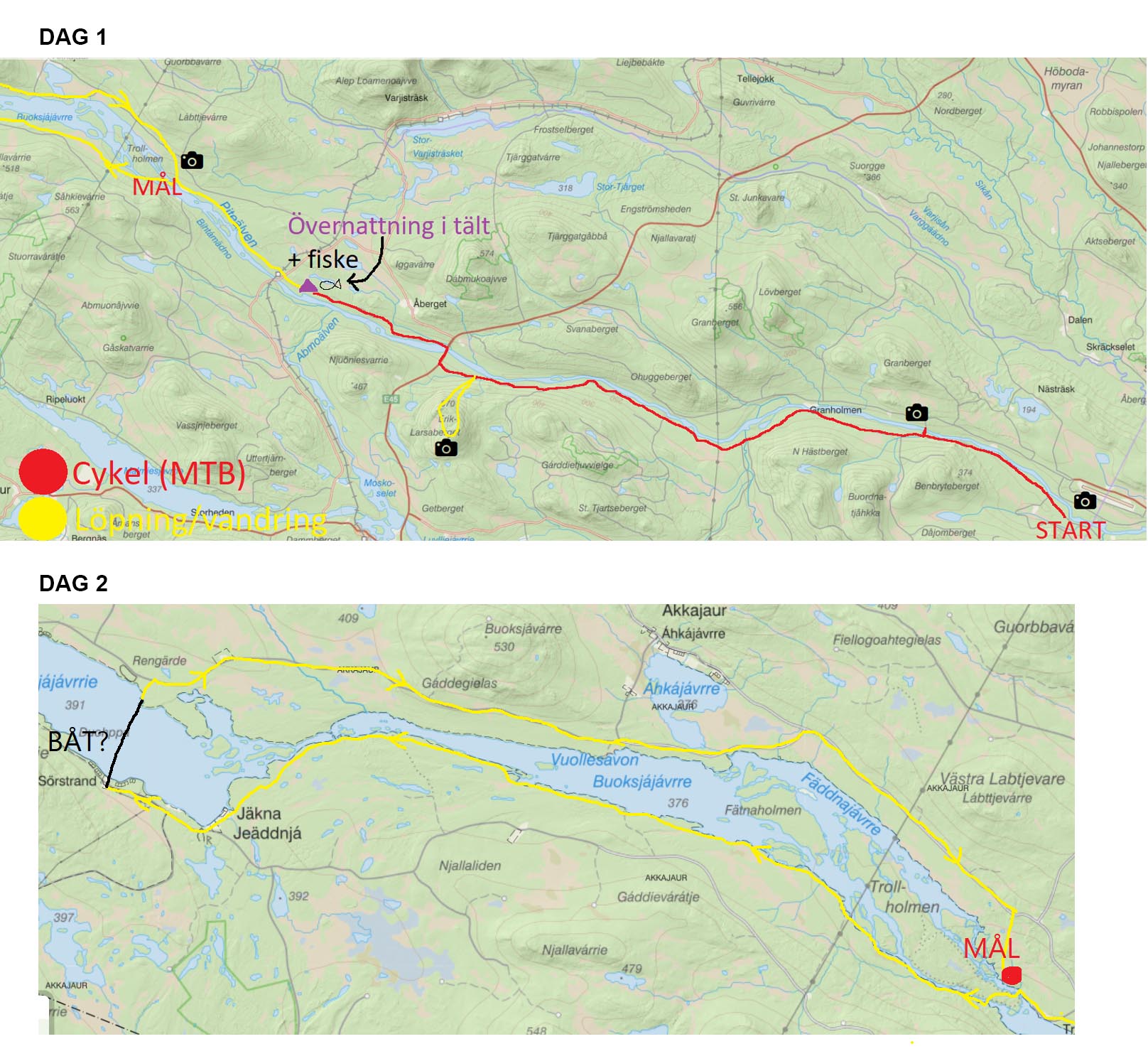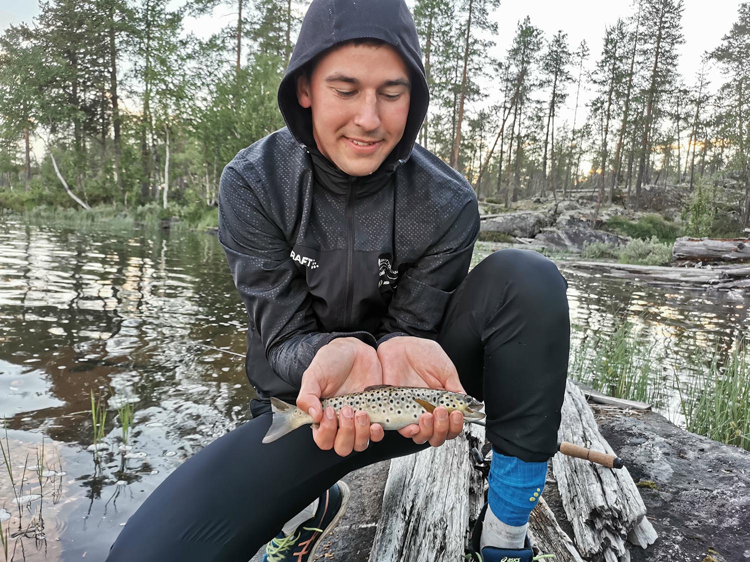 Med mat i magen gick Rasmus som tagit med sig teleskopfiskespöet ner till vattnet och fiskade, ganska länge utan något napp. När det började närma sig kvällen kom pappa för att hämta upp våra cyklar och stora packningen inför morgondagen. Han lämnade även en extra gasoltub. Efter det kunde vi göra vår kvällsgröt. Gott med mat. Jag var trött och ville sova, men Rasmus ville inte ge upp på fisket. När natten kom stod han fortfarande ute och kastade. Han fick upp en liten öring som han släppte tillbaka men även en ganska stor gädda, som även den fick simma tillbaka. Sedan var det dags att sova, och oj vad skönt att krypa ner i sovsäcken.