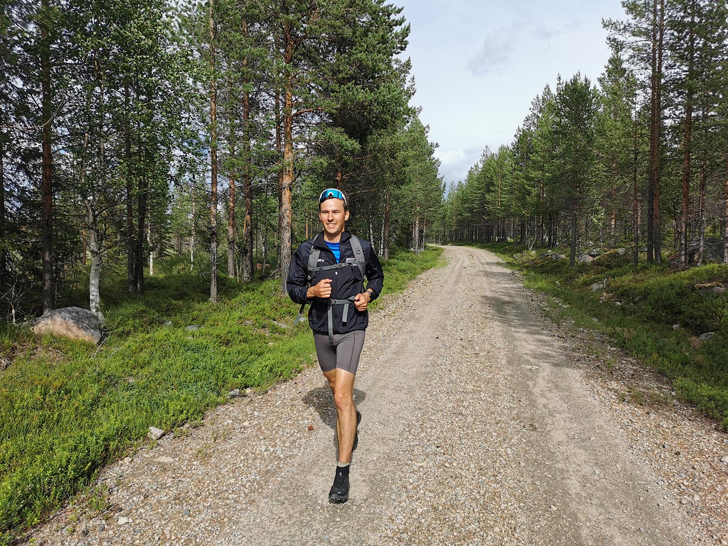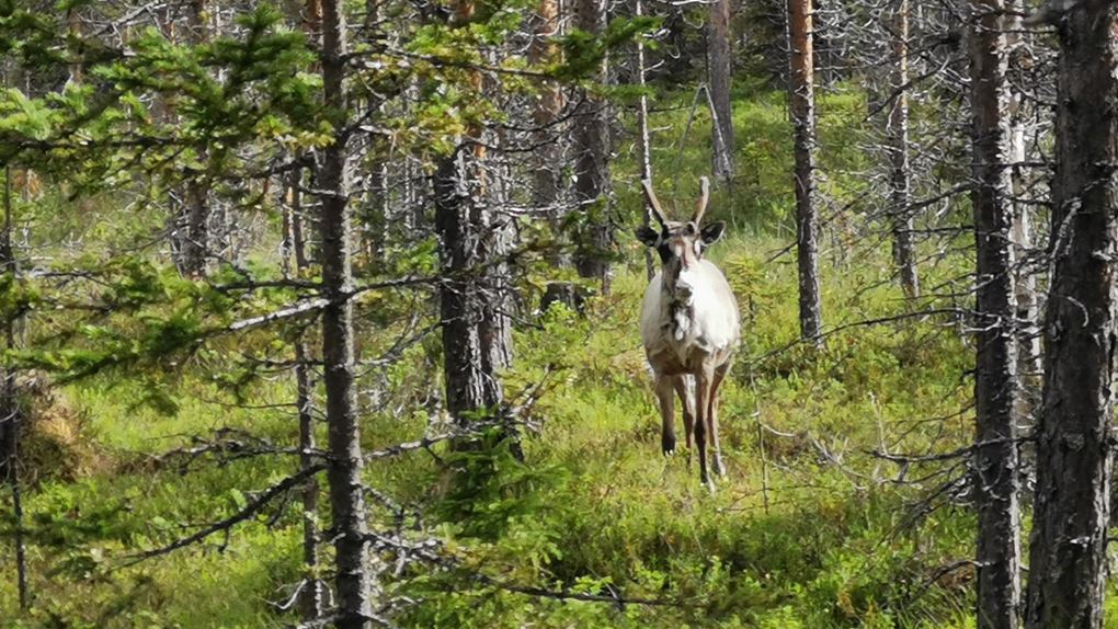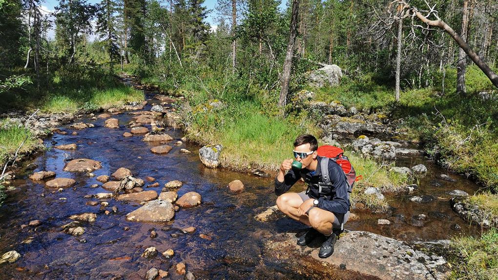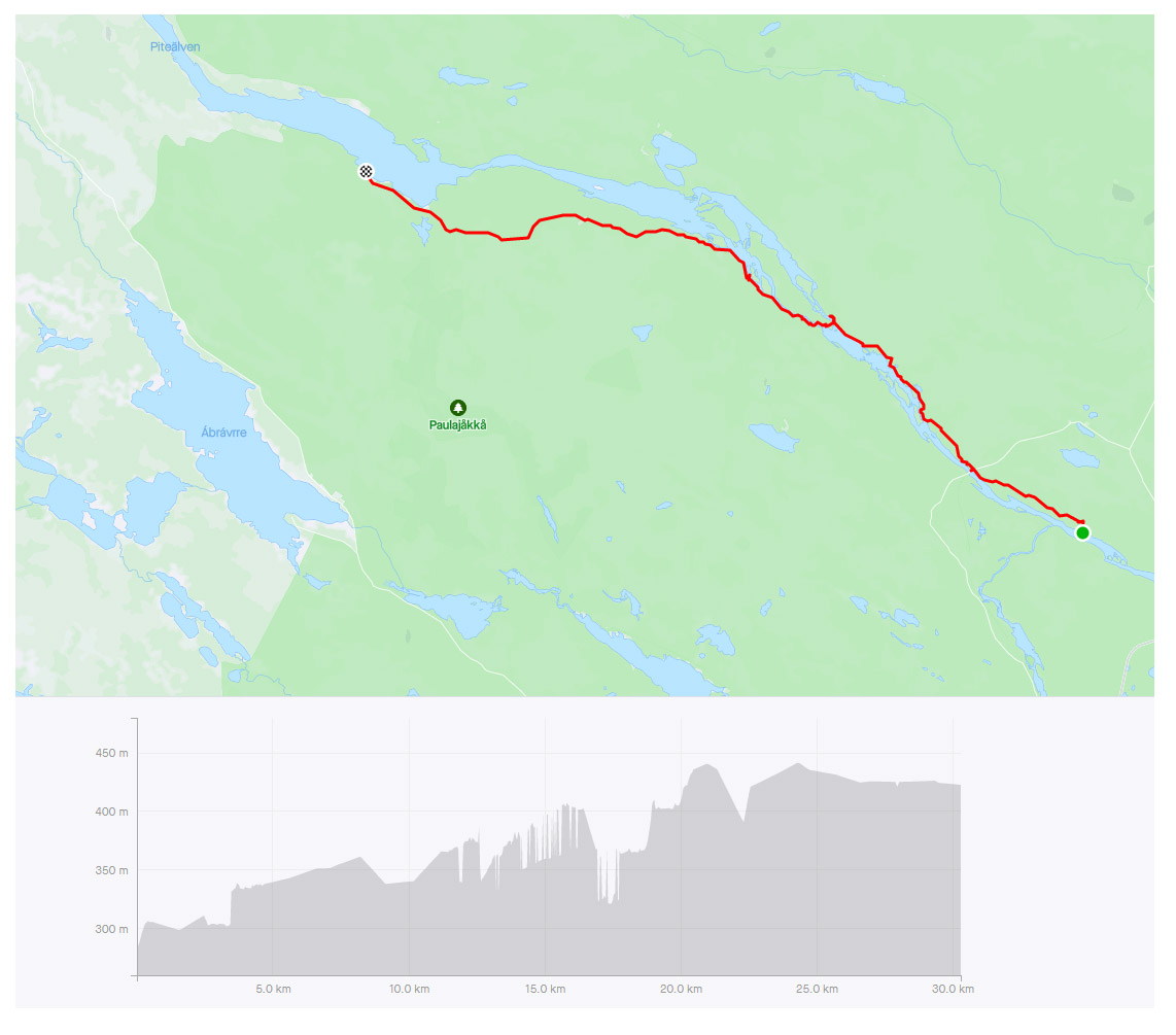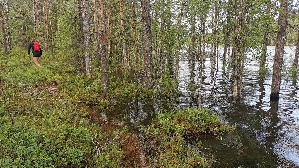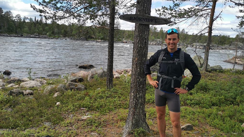 Vi såg några renar medan vi en bit till kunde springa på en fin tallhed. När tallheden övergick i slyskog med myrmark letade vi oss upp till vägen. Rasmus som var något piggare än jag försökte prata för att hålla stämningen uppe, och även om jag faktiskt höll humöret uppe så sprang jag tyst och försökte gå in i ett "mode" att bara springa på, steg efter steg. En tråkigare väg en bit från älven men betydligt roligare för benen. Väl på vägen avverkade vi kilometrarna relativt snabbt. Stannade och tryckte lite energi-gel och godis för att inte nå den beryktade "väggen" och så småningom nådde vi Jäkna. Ner till vattnet för att dricka vatten som vi nu ganska lång tid varit utan då vi avvikit från älven. Gott!