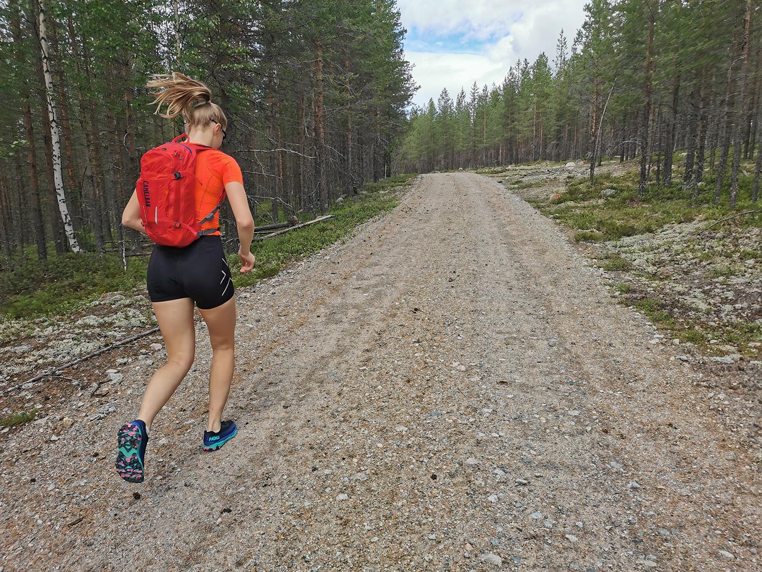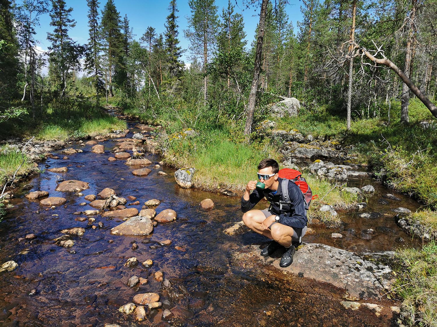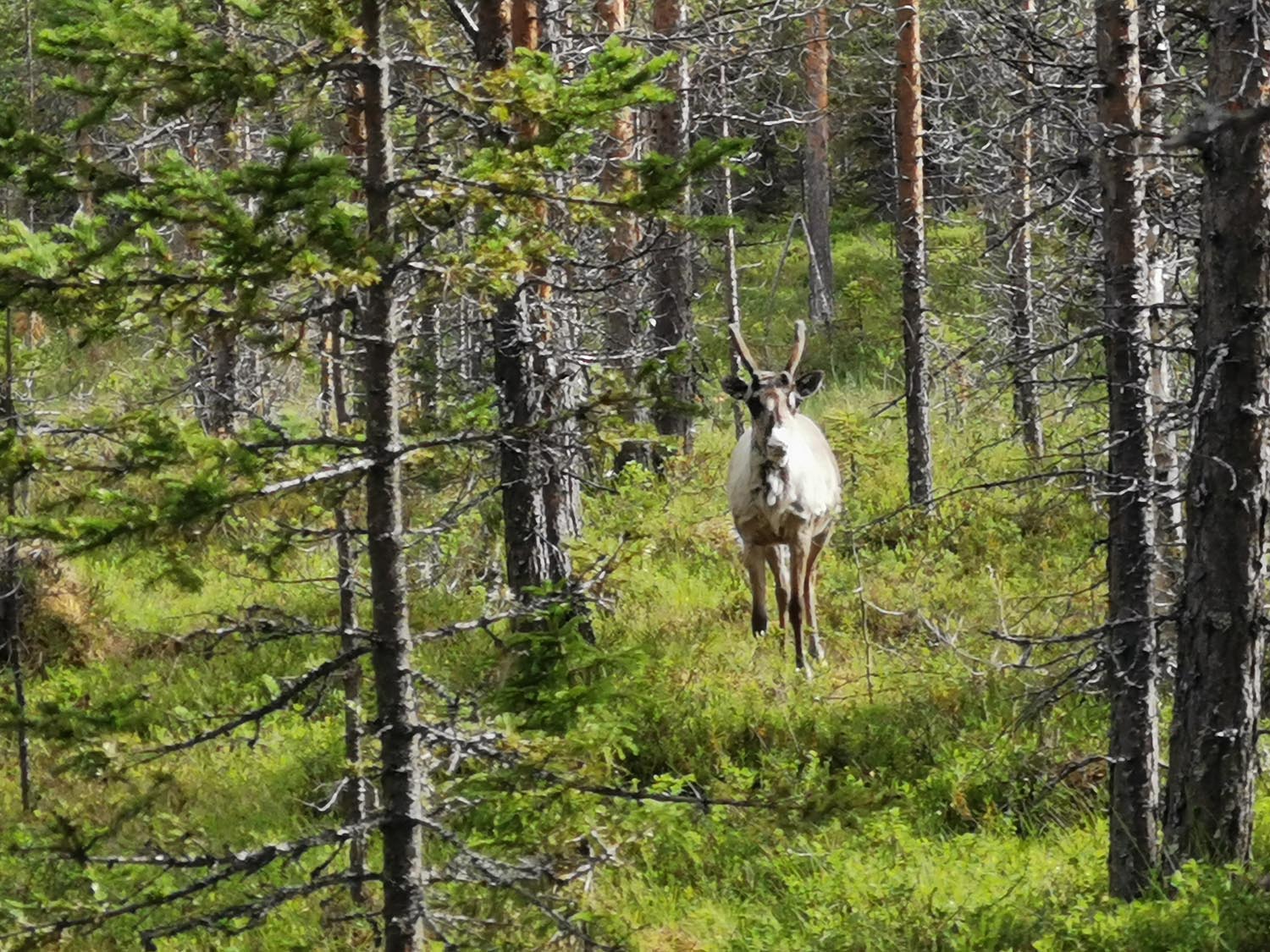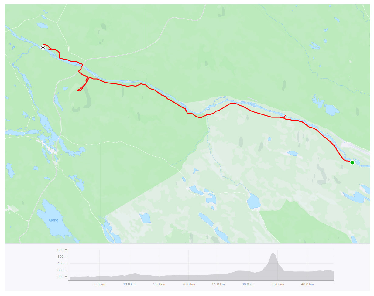 Vi såg några renar medan vi en bit till kunde springa på en fin tallhed. När tallheden övergick i slyskog med myrmark letade vi oss upp till vägen. Rasmus som var något piggare än jag försökte prata för att hålla stämningen uppe, och även om jag faktiskt höll humöret uppe så sprang jag tyst och försökte gå in i ett "mode" att bara springa på, steg efter steg. En tråkigare väg en bit från älven men betydligt roligare för benen. Väl på vägen avverkade vi kilometrarna relativt snabbt. Stannade och tryckte lite energi-gel och godis för att inte nå den beryktade "väggen" och så småningom nådde vi Jäkna. Ner till vattnet för att dricka vatten som vi nu ganska lång tid varit utan då vi avvikit från älven. Gott!