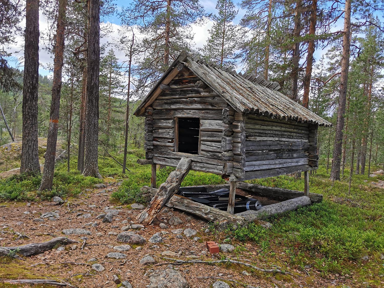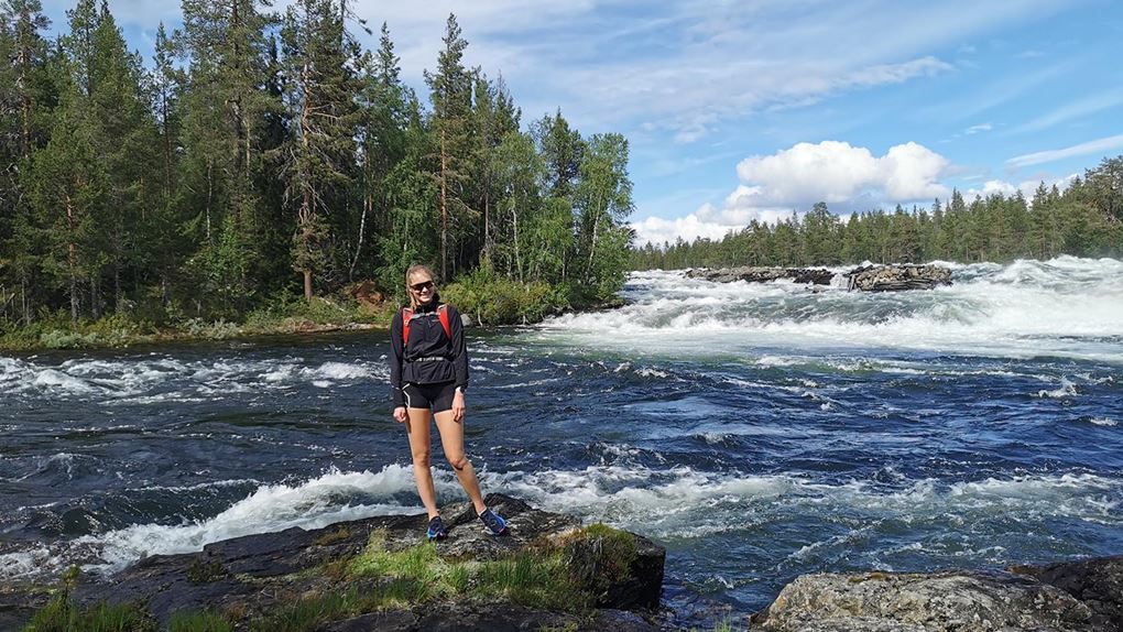 Stigen fortsatte att följa älven och vi fick springa i fin terräng. Den gick ner till lite olika forsar längs älven, bland annat Björnideforsen. Där såg vi fina forsar med stenkistor och mycket spår från flottningen, vilket var kul att se. Spår från flottningstiden var något vi såg under hela vårt äventyr då det varit en betydande del i Piteälvens historia.