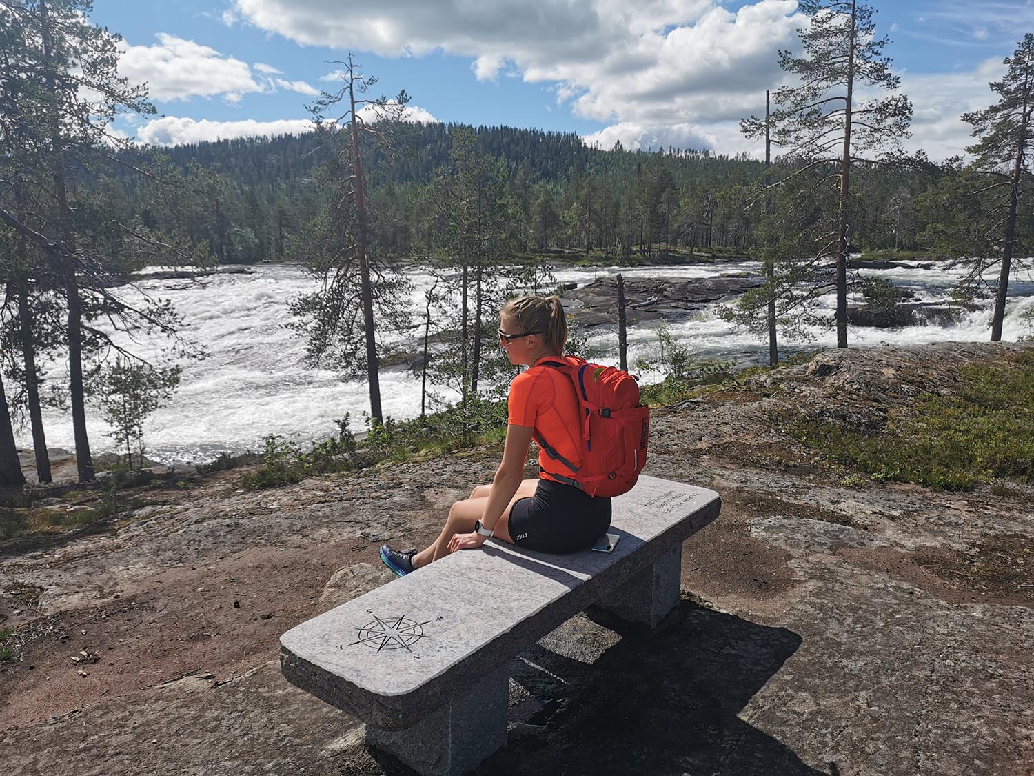 Till slut kom vi fram till Trollforsen, trötta och hungriga. Vi joggade och tittade på hängbron och den gamla timrade stugan från samer, innan vi till slut hittade den berömda stenbänken, som sattes dit vid invigningen av ekoparken 2014. Solen hade lyst på den så den var varm och skön och perfekt att sitta på med våra trötta kroppar. En perfekt lunchplats med utsikt över den mäktiga forsen med den gamla fina naturen.