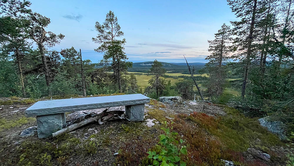 - Stenbänken på berget Rova Heikkamavaara i ekoparkens nordöstra del är ett minne från ekoparksinvigningen. Här kan du blicka ut över en mycket vacker och vidsträckt vy över ekoparkens karaktäristiska landskap: en stor myr, bergen Karhuvaara och Mettä, och gamla skogar. På försommaren kan du njuta av och lyssna till det enormt rika fågelliv som ljuder från våtmarkerna nedanför. Det är en fantastisk upplevelse.