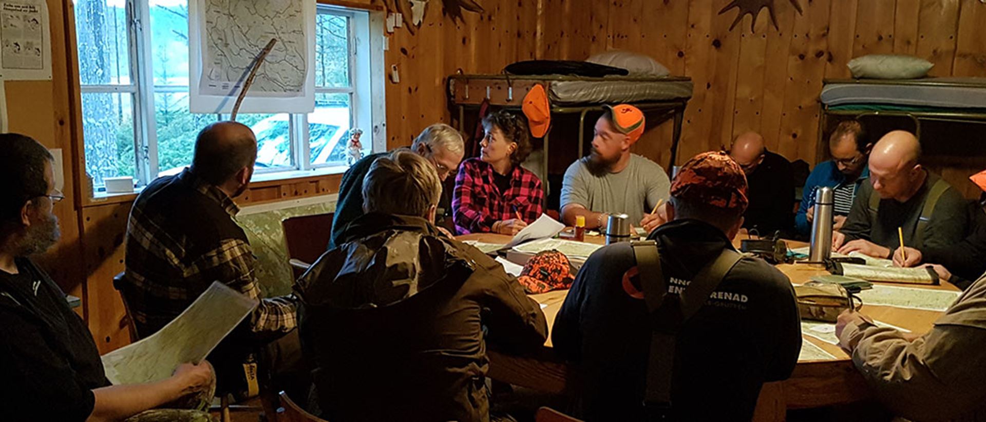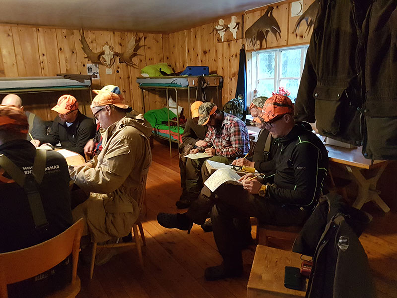 Vid den tidiga samlingen i jaktstugan drar passkyttarna ett kort ur en kortlek och får i tur och ordning välja pass. De som inte har egen jaktradio får låna.